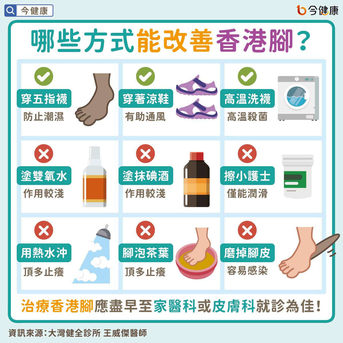 王威傑說明,預防香港腳的重點,仍須著重在腳足底的衛生習慣,腳部進水之後盡快用吹風機擦乾、吹乾,襪子浸溼後盡快更換,並選擇棉質可吸汗的材質。至於常見的五趾襪,可以預防趾間殘留汗水形成潮濕環境,也有少部份的預防作用。
